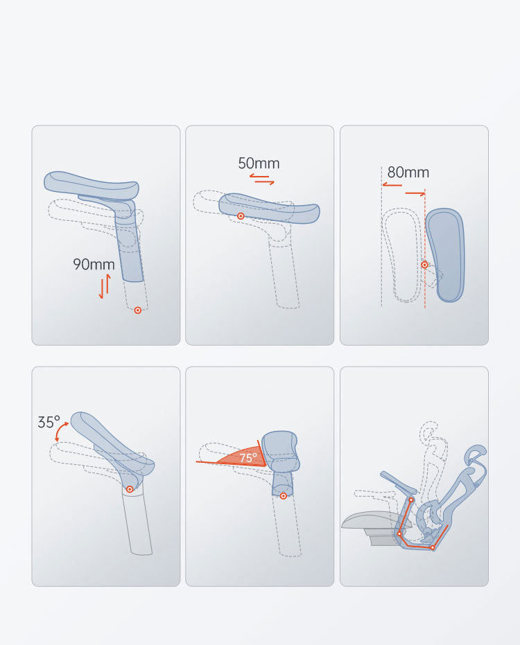 Les accoudoirs moelleux et souples, s'ajustent en trois directions : en hauteur, en profondeur et en rotation jusqu'à 75 degrés.